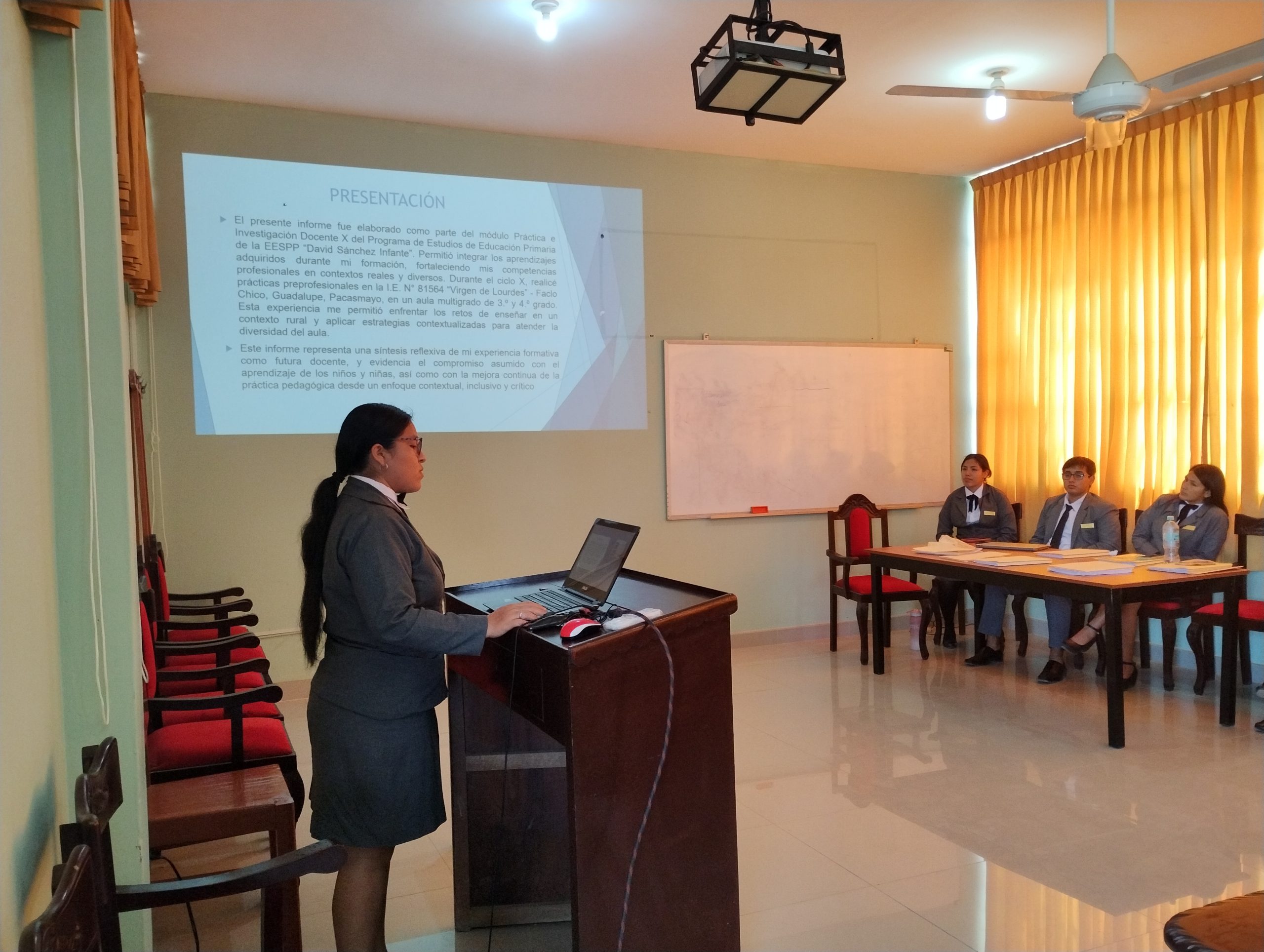 Con la sustentación de sus informes finales de este Módulo de Investigación y Práctica X, los estudiantes del ciclo X – Educación Primaria dan por culminado su programa de formación profesional en la EESPP «David Sánchez Infante» de San Pedro de Lloc, pues este módulo corresponde a un requisito previo para la sustentación de sus Informes de Investigación para la obtención del Grado de Bachiller en Educación Primaria. Dicha sustentación se llevará a cabo el día 08 de agosto de 2025, de la cual, luego estaremos informando detalles por este mismo sitio web.