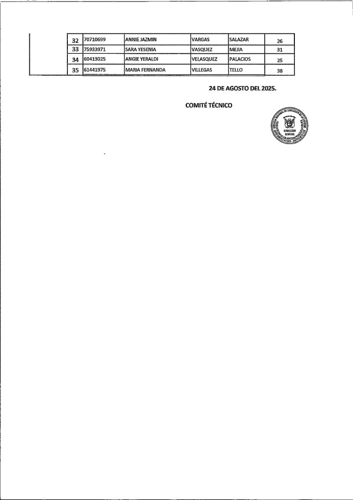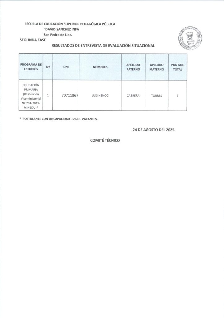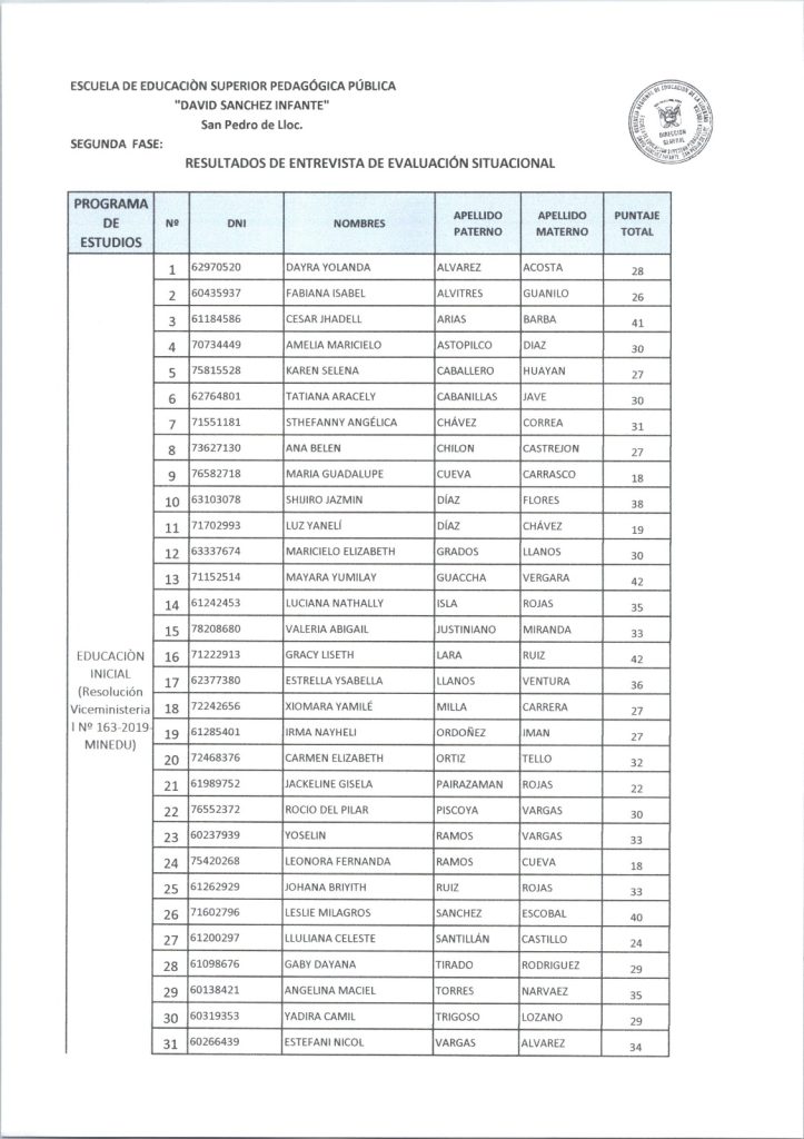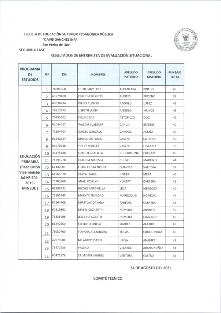 RESULTADOS DE LA SEGUNDA PARTE DEL PROCESO DE ADMISIÓN 2025-II DE LA ESCUELA "DAVID SÁNCHEZ INFANTE" EDUCACIÓN INICIAL EDUCACIÓN PRIMARIA