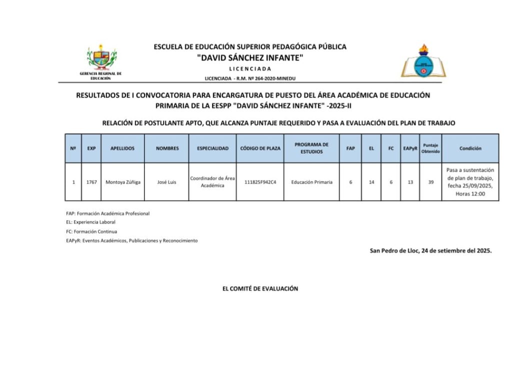 RELACIÓN DE APTOS PARA LA EVALUACIÓN DE PLAN DE TRABAJO DE LA I CONVOCATORIA PARA ENCARGATURA DE PUESTO DEL ÁREA ACADÉMICA DE EDUCACIÓN PRIMARIA DE LA EESPP «DSI» -2025-II